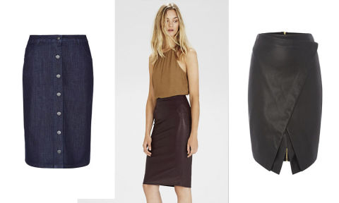 Thought you couldn't wear a form-fitting pencil skirt? Think again! It'll work wonders on your middle - the trick is to choose a high-waist style in a structured fabric. The thicker fabric will smooth from the waist down and the high rise will help create the illusion of a slimmer middle. Try an on-trend denim or leather version.